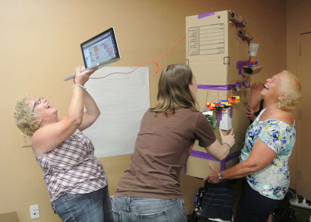 Maria’s joy was infectious and she was always willing to give something new a try. Sadly, I was late to the Maria Knee party. It turns out that before she arrived as one of the couple dozen educators attending the first Constructing Modern Knowledge institute, she was already known in edtech circles for her work connecting classrooms of young children online. My fondest memories of Maria include her collaborating with the father of microcomputer based laboratories, Bob Tinker, at the first CMK in 2008, and a few years later creating a hilarious high-tech contraption with her “bestie” from Australia and a young teacher who I know grew immeasurably in proximity to “Lucy and Ethel.” It was a great privilege to have Maria as a Constructing Modern Knowledge faculty member, schlepper, and confidante.