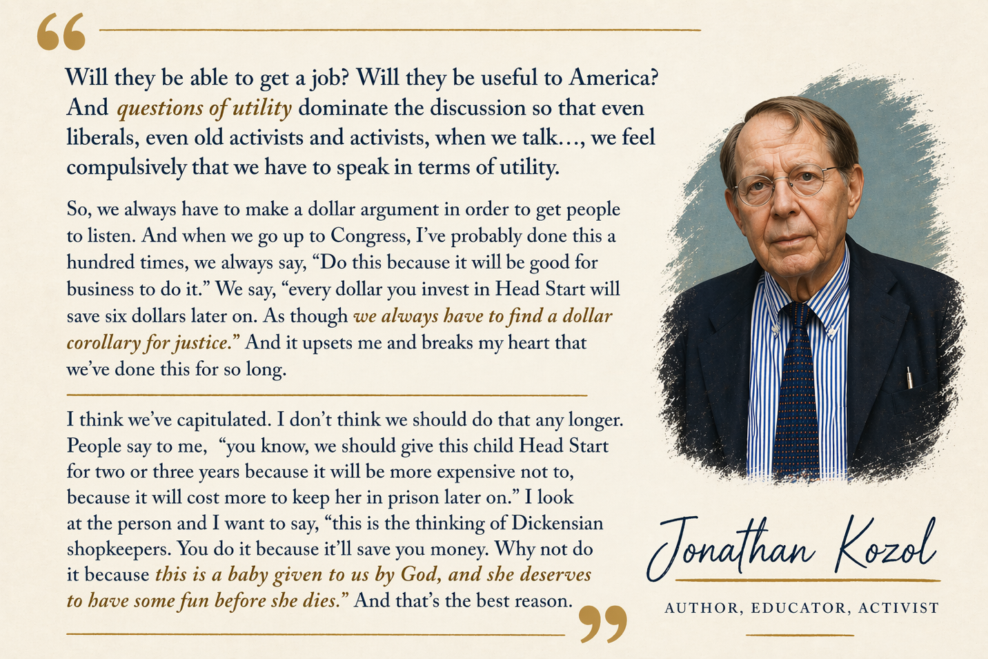 There are few more occasions for celebration than the publication of a new book by civil rights activist, educator, and National Book Award-winning author Jonathan Kozol. For six decades, Kozol has given voice to children, particularly those deprived of the benefits, dignity, and opportunity society lavishes on the affluent. Everyone needs to read Kozol, regardless of where you live or your socio-economic status. His work will move you to think, feel, and act. Kozol is also a spectacular writer.